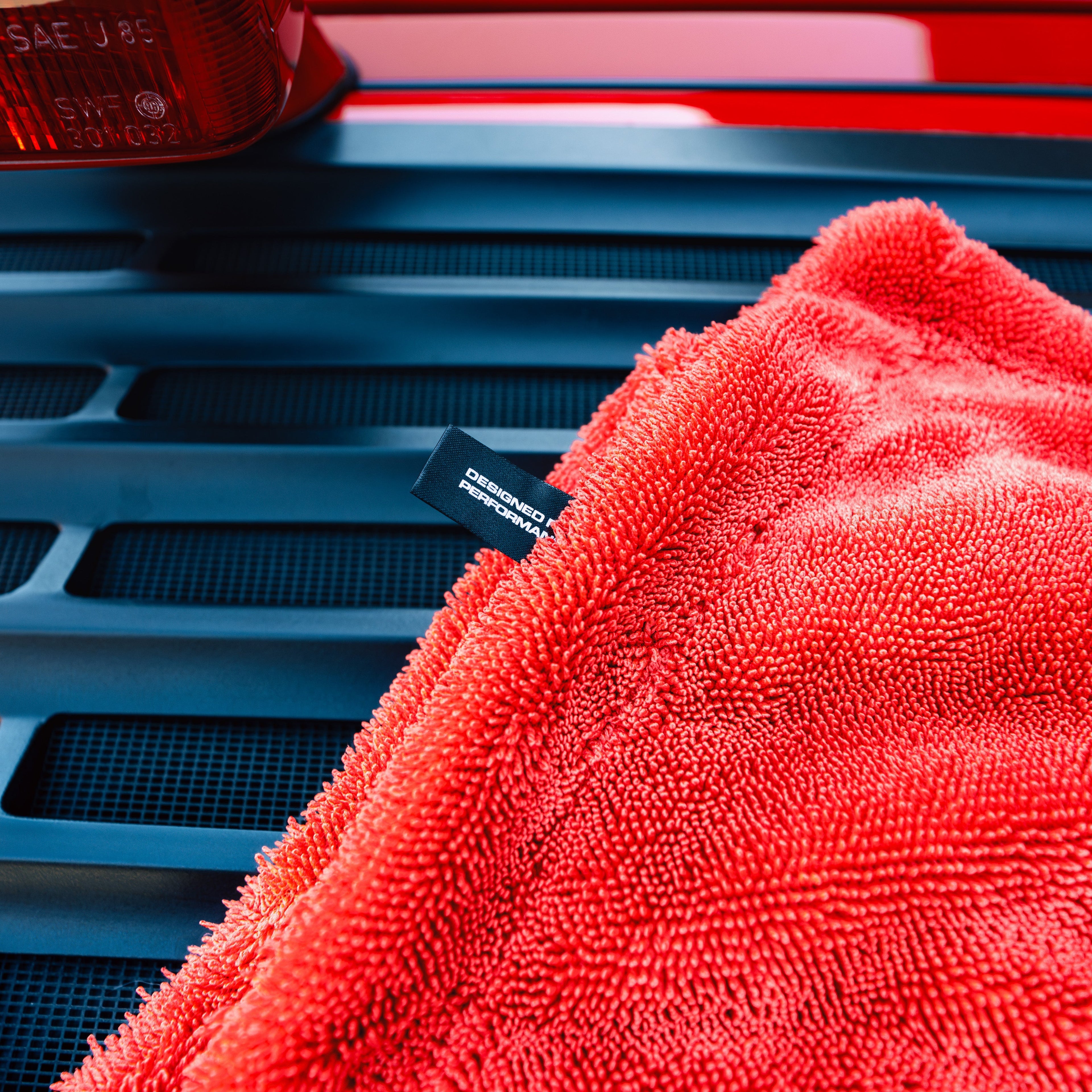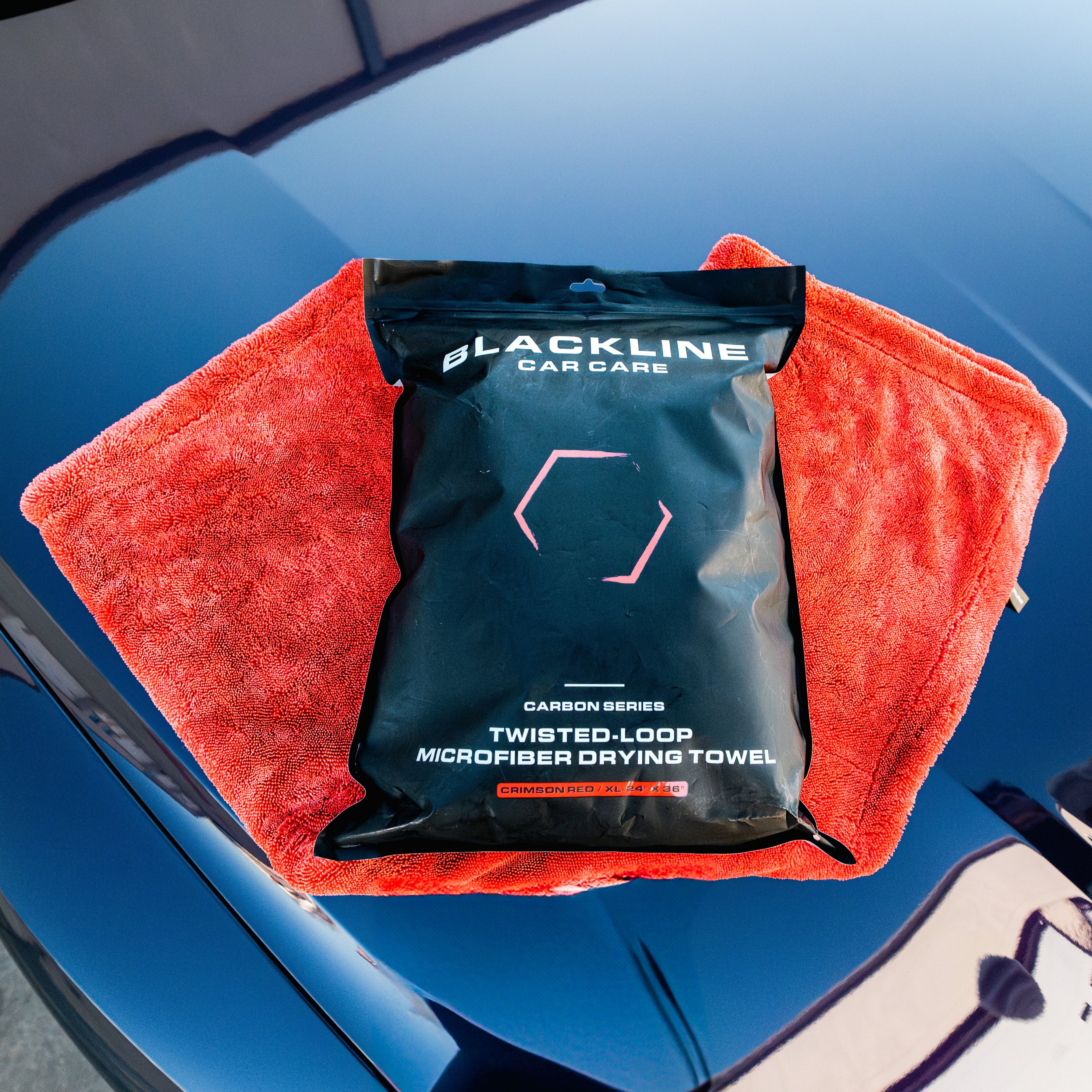 Blackline Twisted-Loop Drying Towel absorbs water instantly, leaving your vehicle dry, streak-free, and spotless after every wash. The 1300 GSM twisted-loop fibers pull moisture off the surface with almost no pressure, creating a smooth, gliding feel as the towel moves across paint, glass, and trim. Its large 2x3 ft size and thick construction hold more than a gallon of water, allowing you to dry multiple cars at once. The Twisted-Loop Drying Towel is a game changer, making post wash care faster, safer, and noticeably more effortless.